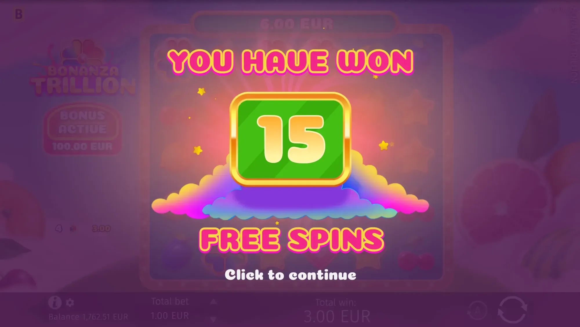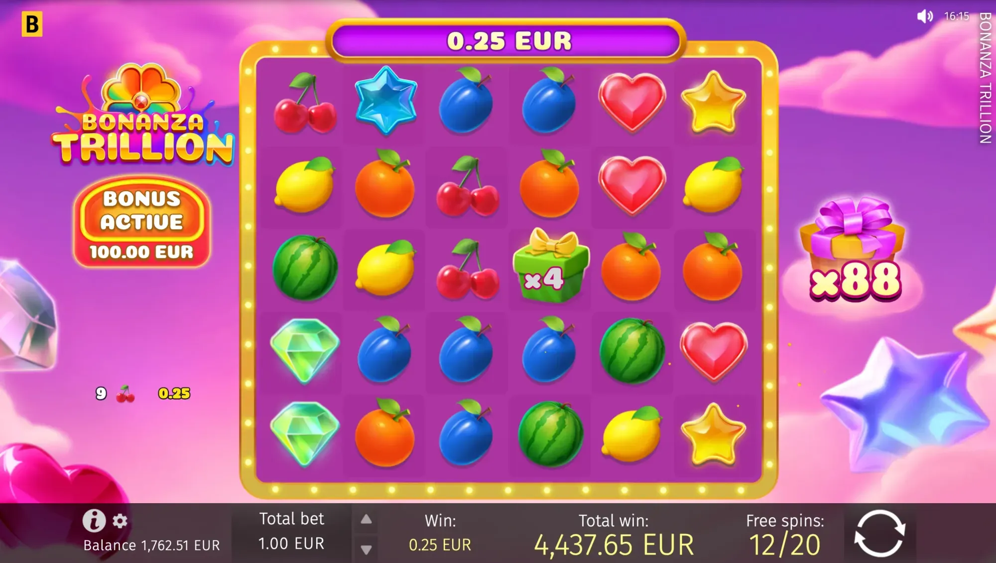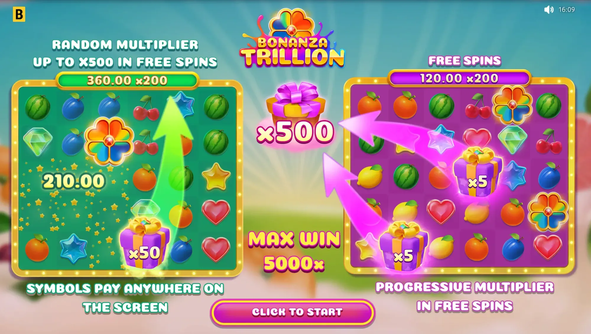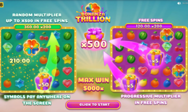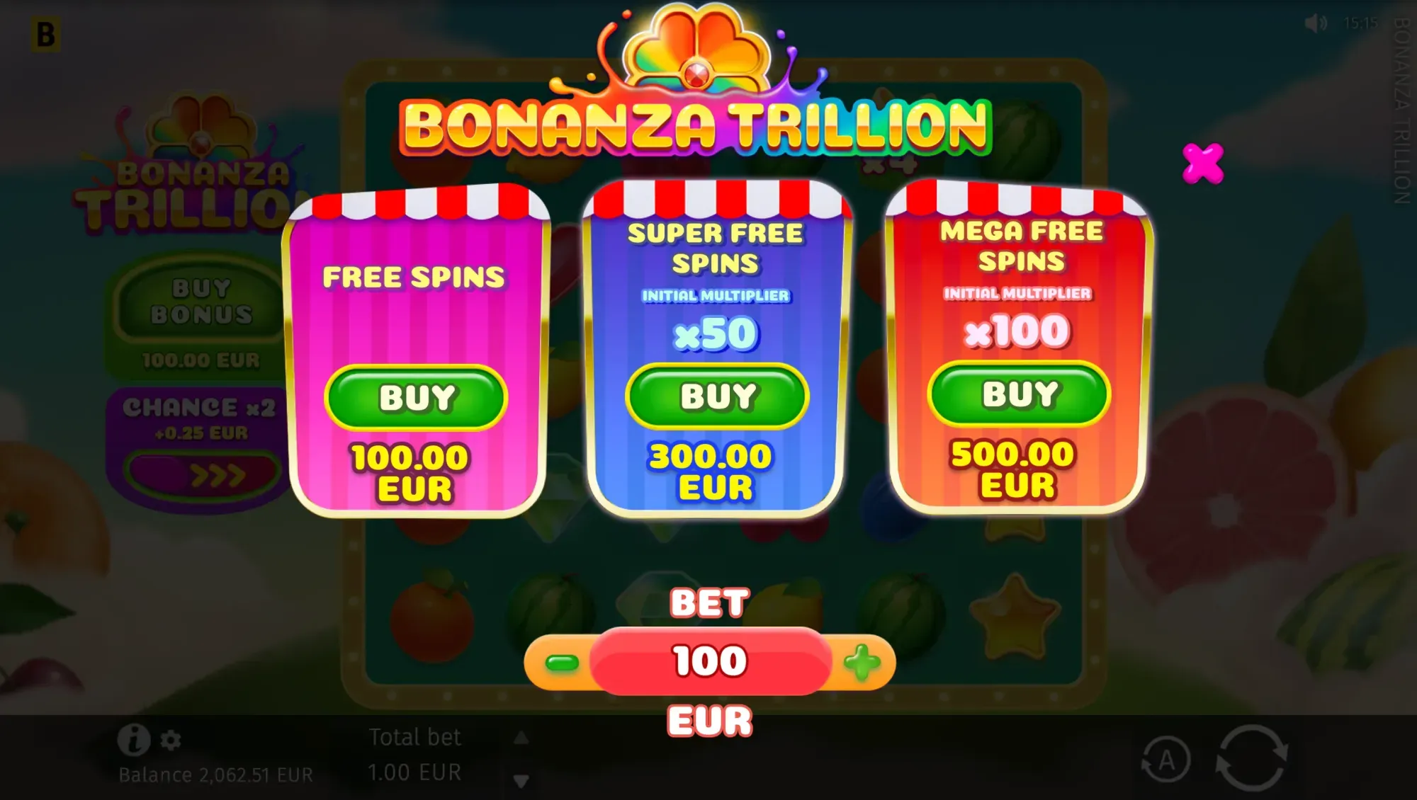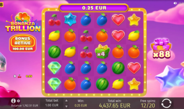 O caça-níqueis Bonanza Trillion abre as portas para um mundo iluminado pelo sol, onde frutas suculentas e cristais cintilantes caem em cascata pelas bobinas em uma tela animada e colorida. O design inspirado em dispositivos móveis refresca o adorado universo Bonanza Billion da BGaming, envolvendo os jogadores em uma vibrante atmosfera de verão, repleta de frutas doces e joias brilhantes. Os símbolos estouram e caem, criando espaço para novos símbolos e desencadeando vitórias consecutivas que mantêm viva a emoção.