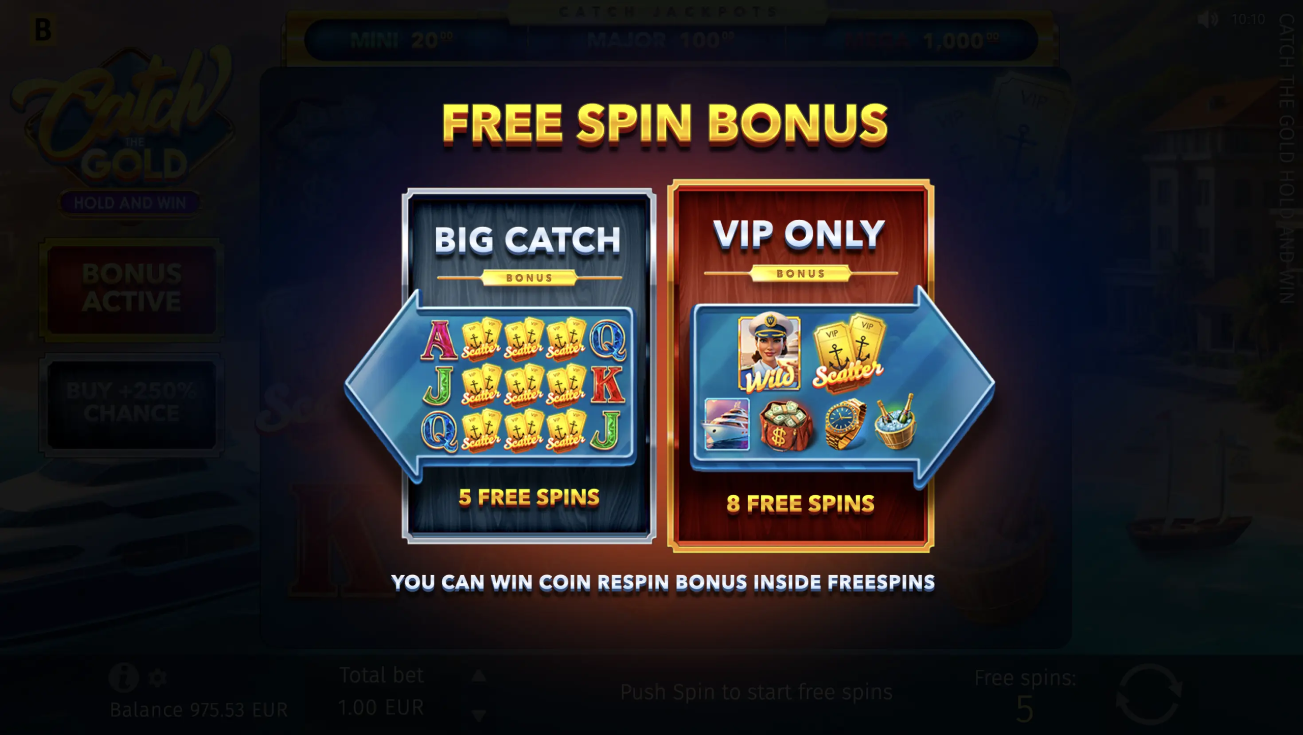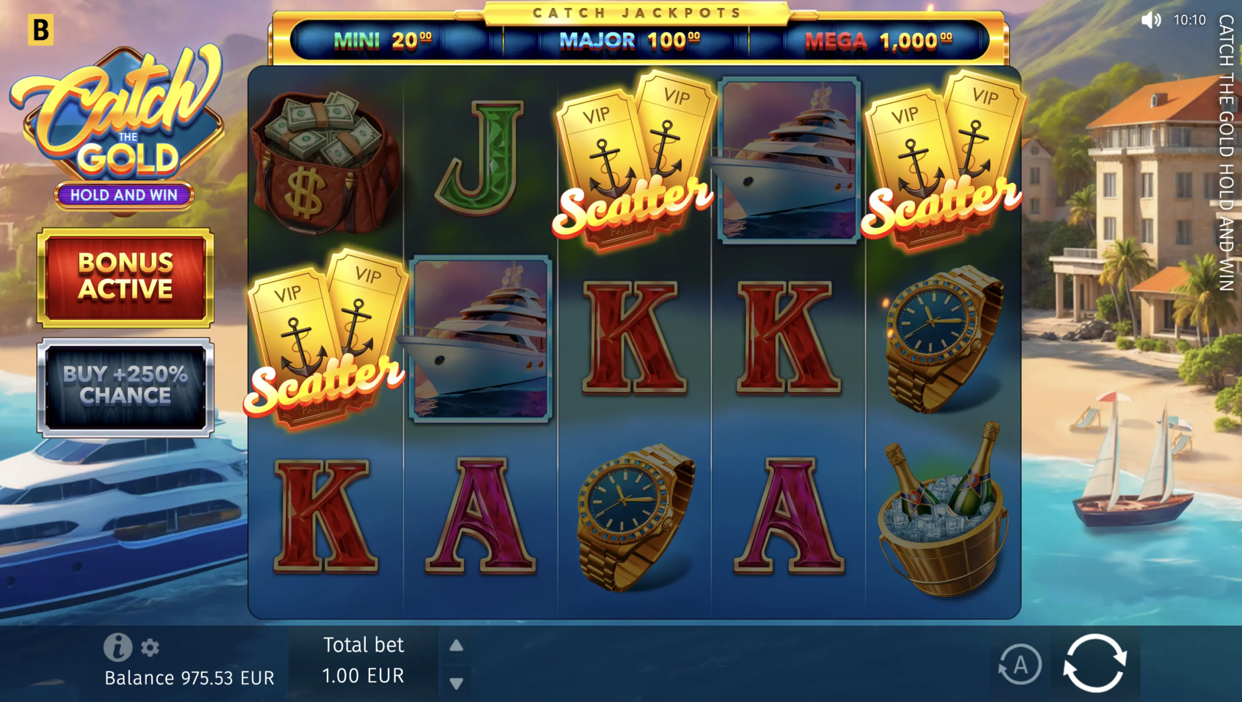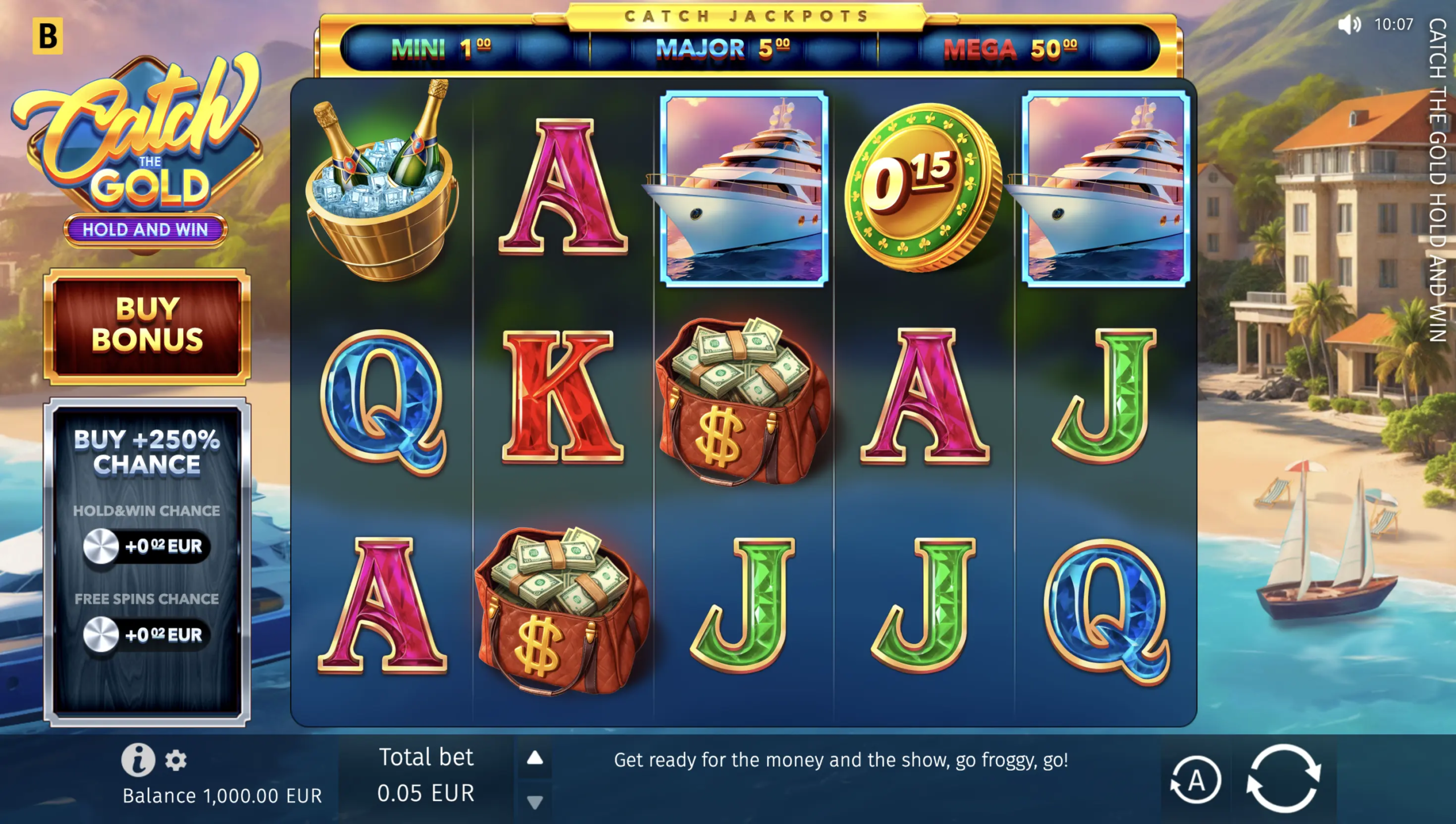 Atenção, todos os participantes do cruzeiro! Observe que seu pacote exclusivo inclui uma cerimônia luxuosa de Hold & Win com 3 jackpots suficientes e 2 eventos excepcionais de rodadas grátis. Durante o Big Catch, os rolos 2—4 são preenchidos com o mesmo símbolo por 5 rodadas; enquanto isso, o grupo VIP Only serve apenas símbolos altos a médios para 8 rodadas. Estamos prestes a partir, então tome o champanhe e prepare-se para grandes vitórias!