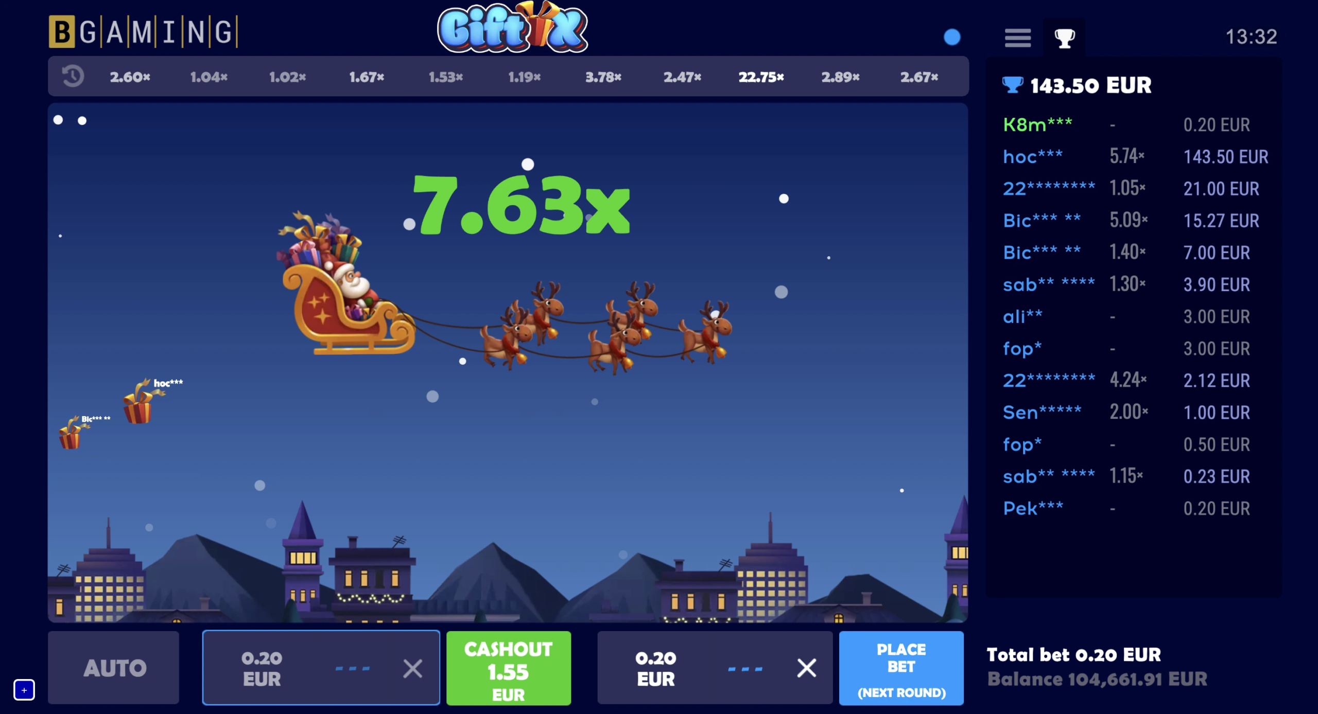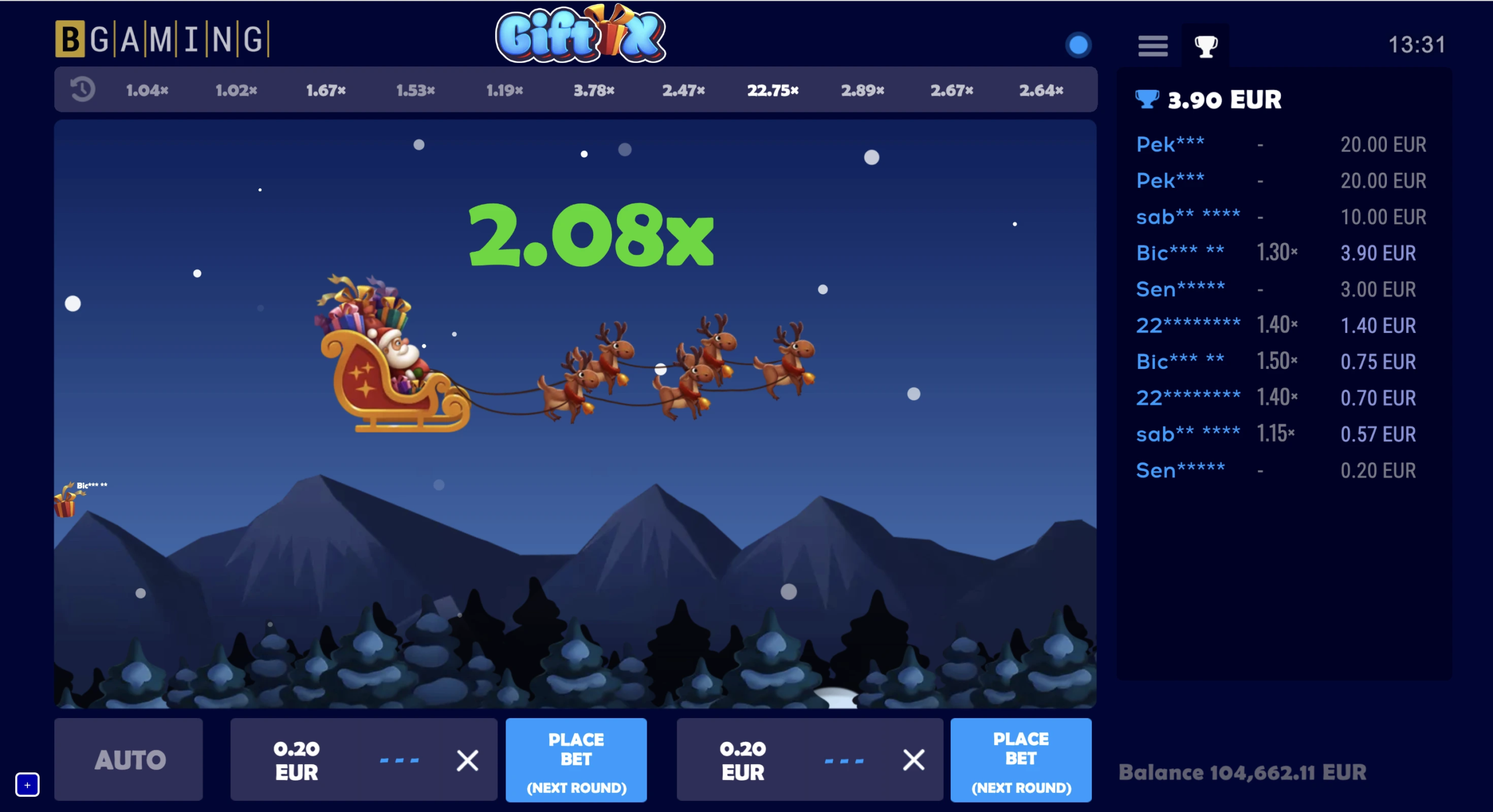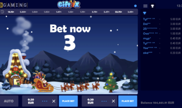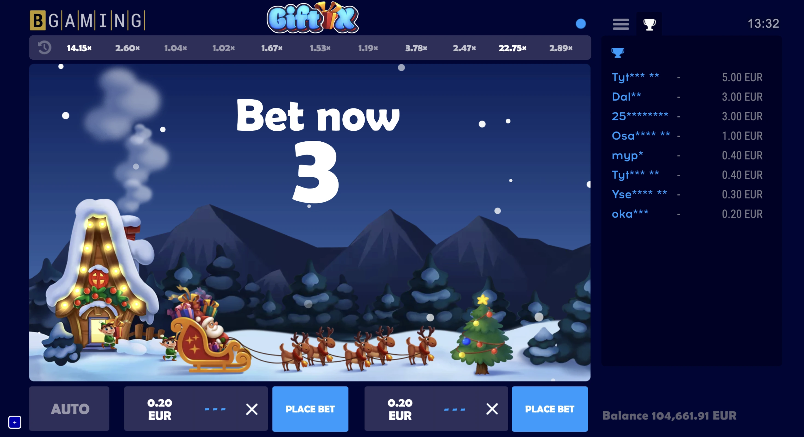 Este jogo de crash repleto de Natal apresenta o Papai Noel voando pelos céus, soltando presentes. Os jogadores fazem 1 ou 2 apostas ao mesmo tempo, assistem ao passeio do Papai Noel e recebem presentes sempre que quiserem antes que o Papai Noel saia.