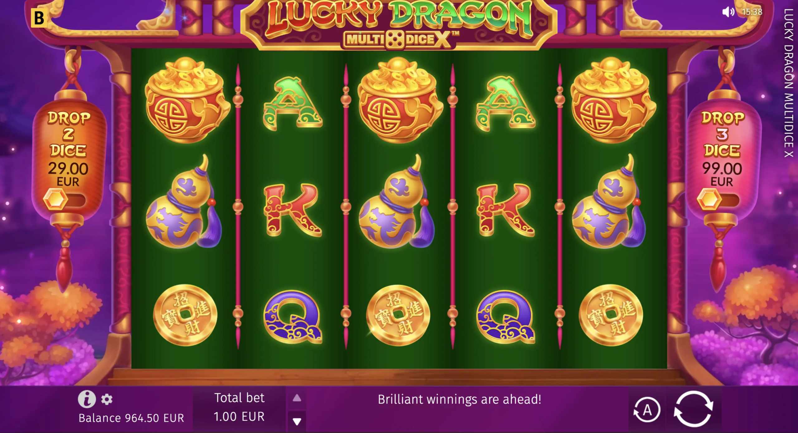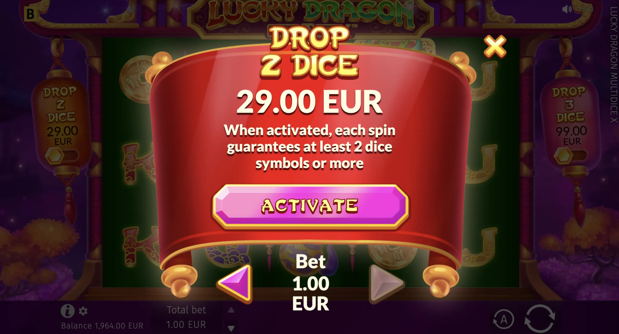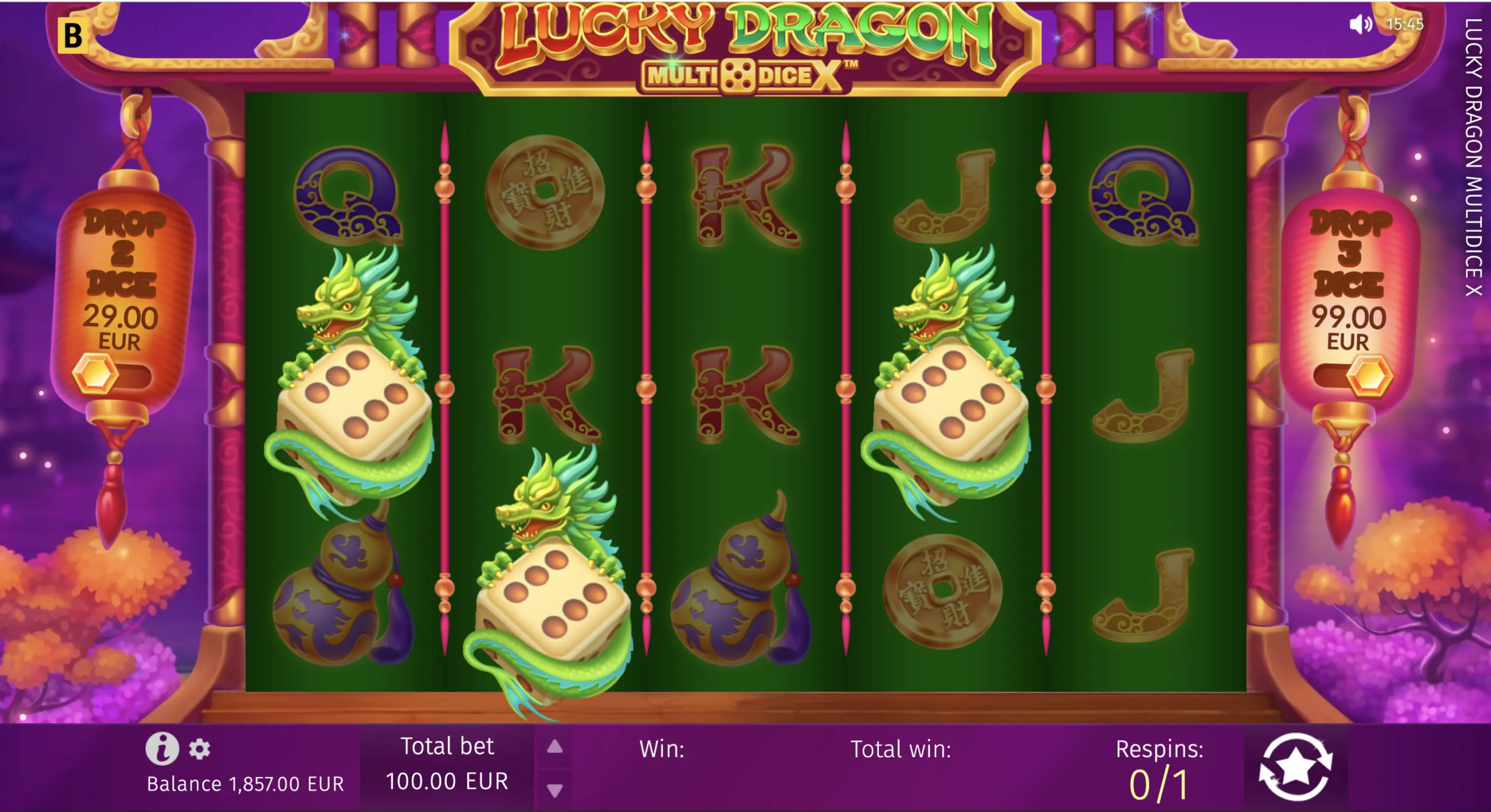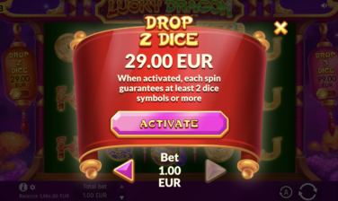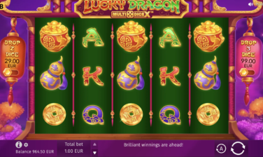 Este caça-níqueis asiático 5×3 brilha com seu recurso especial MultiDice X. Sempre que mais de 2 símbolos Dragon Dice caem, eles rolam, revelando seus valores e multiplicando a aposta inicial. Para acioná-lo imediatamente, os jogadores podem comprar uma rodada com símbolos garantidos de 2 ou 3 dados.