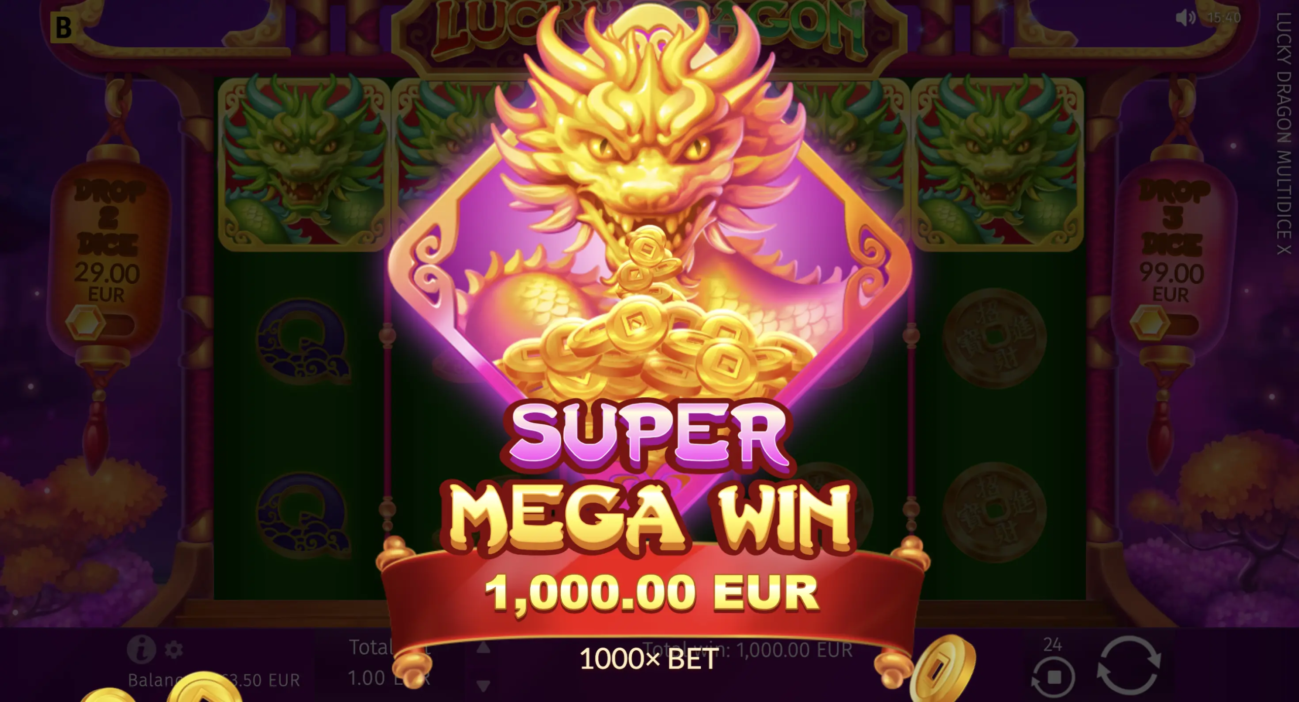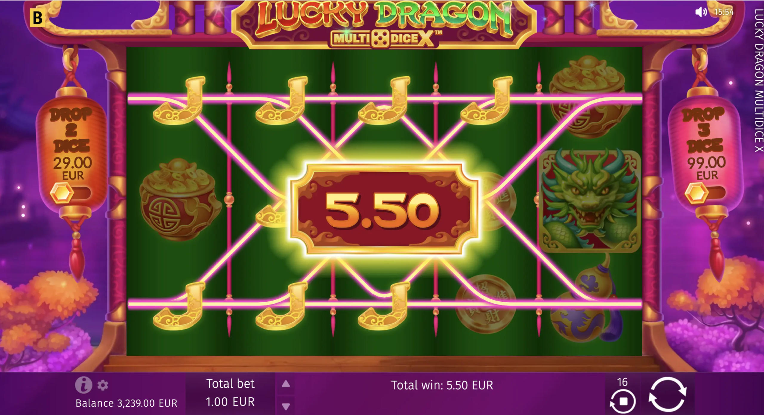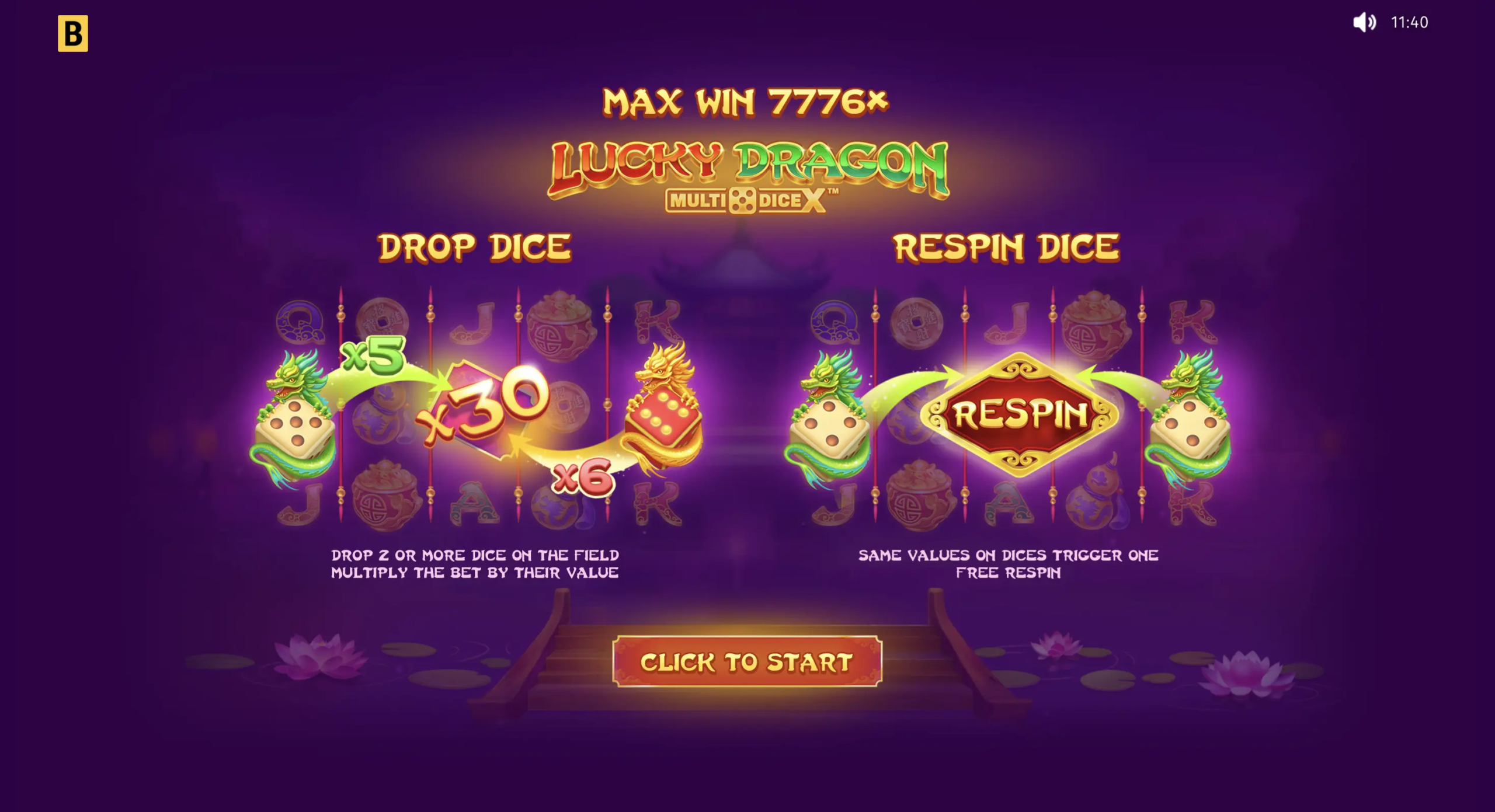 Este caça-níqueis asiático 5×3 brilha com seu recurso especial MultiDice X. Sempre que mais de 2 símbolos Dragon Dice caem, eles rolam, revelando seus valores e multiplicando a aposta inicial. Para acioná-lo imediatamente, os jogadores podem comprar uma rodada com símbolos garantidos de 2 ou 3 dados.
