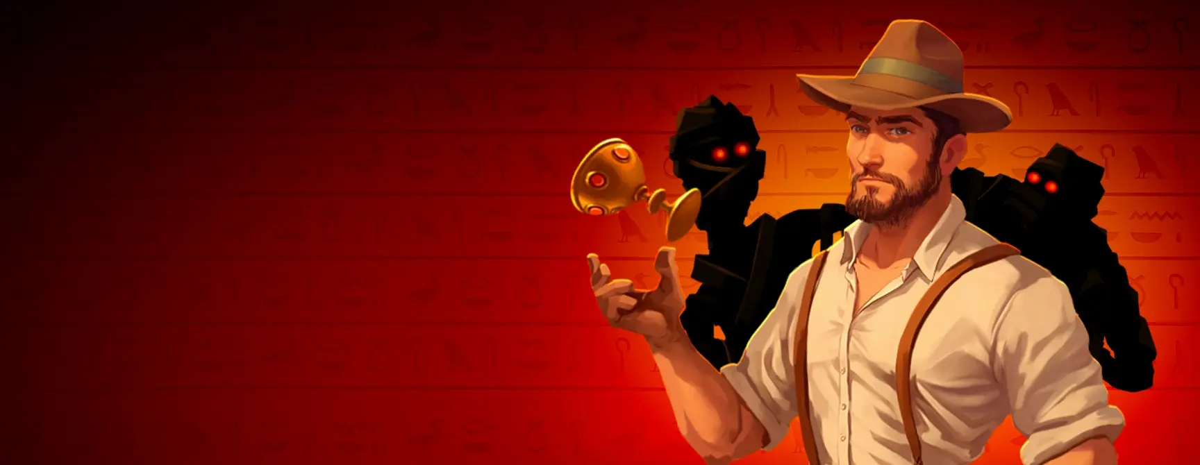 The Egyptian 5×3 slot features treasure symbols and Wilds on spinning reels. Each win unlocks a Gamble round or can lead to free spins inside the mummy tomb, with a chance of retriggering.