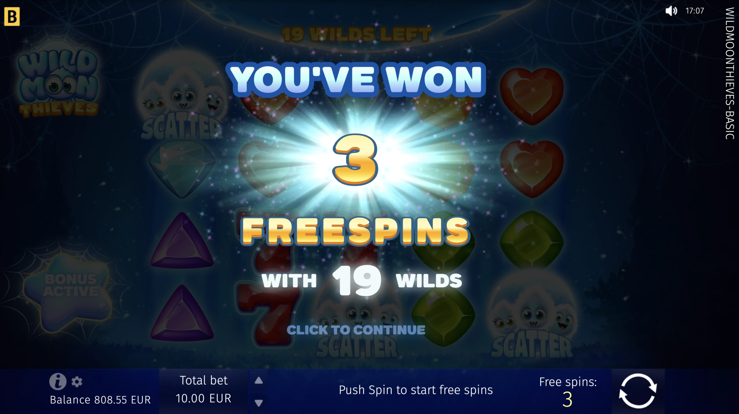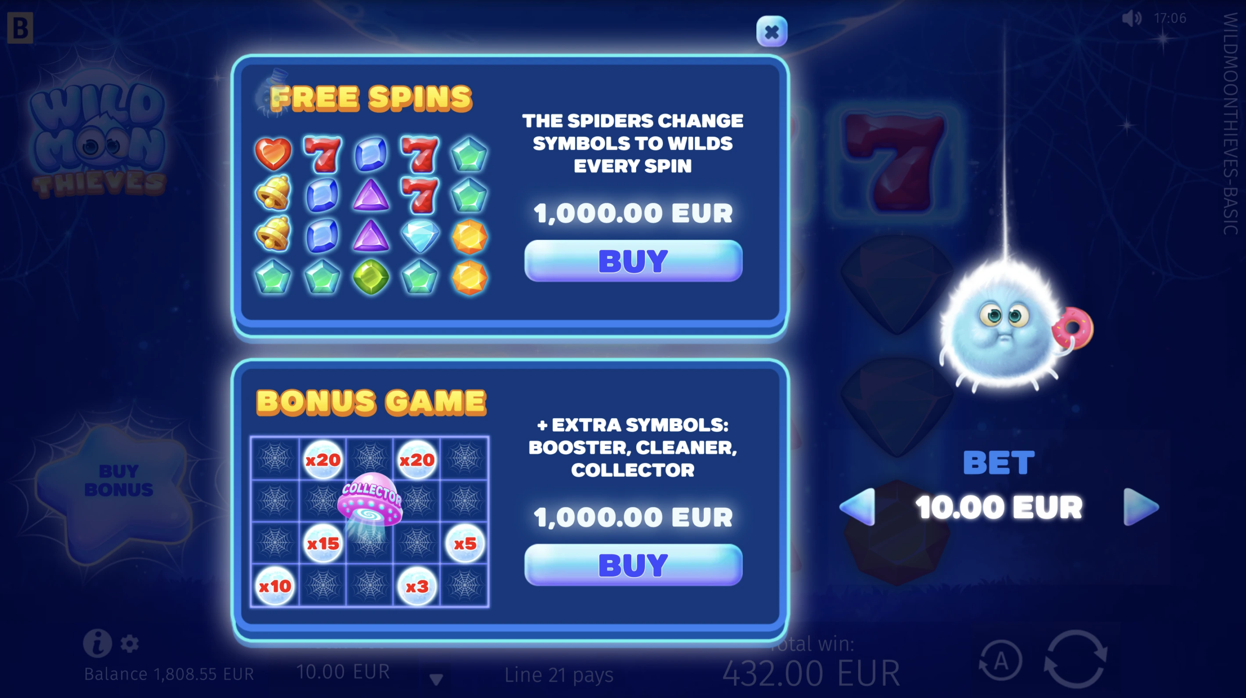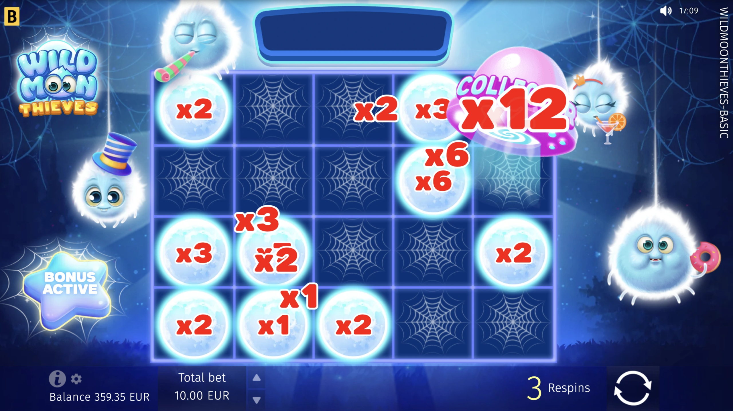 Join the company of magical Wild Moon spiders and revel in joy as they surprise you by generously replacing shining gems, sevens, and golden bells with Wild web symbols! Play Free Spins with Wild showers for every spin and try the Hold and Win–style Bonus game, collecting Moon Multipliers for stellar payouts. An over-the-moon slot game experience is at your fingertips!
