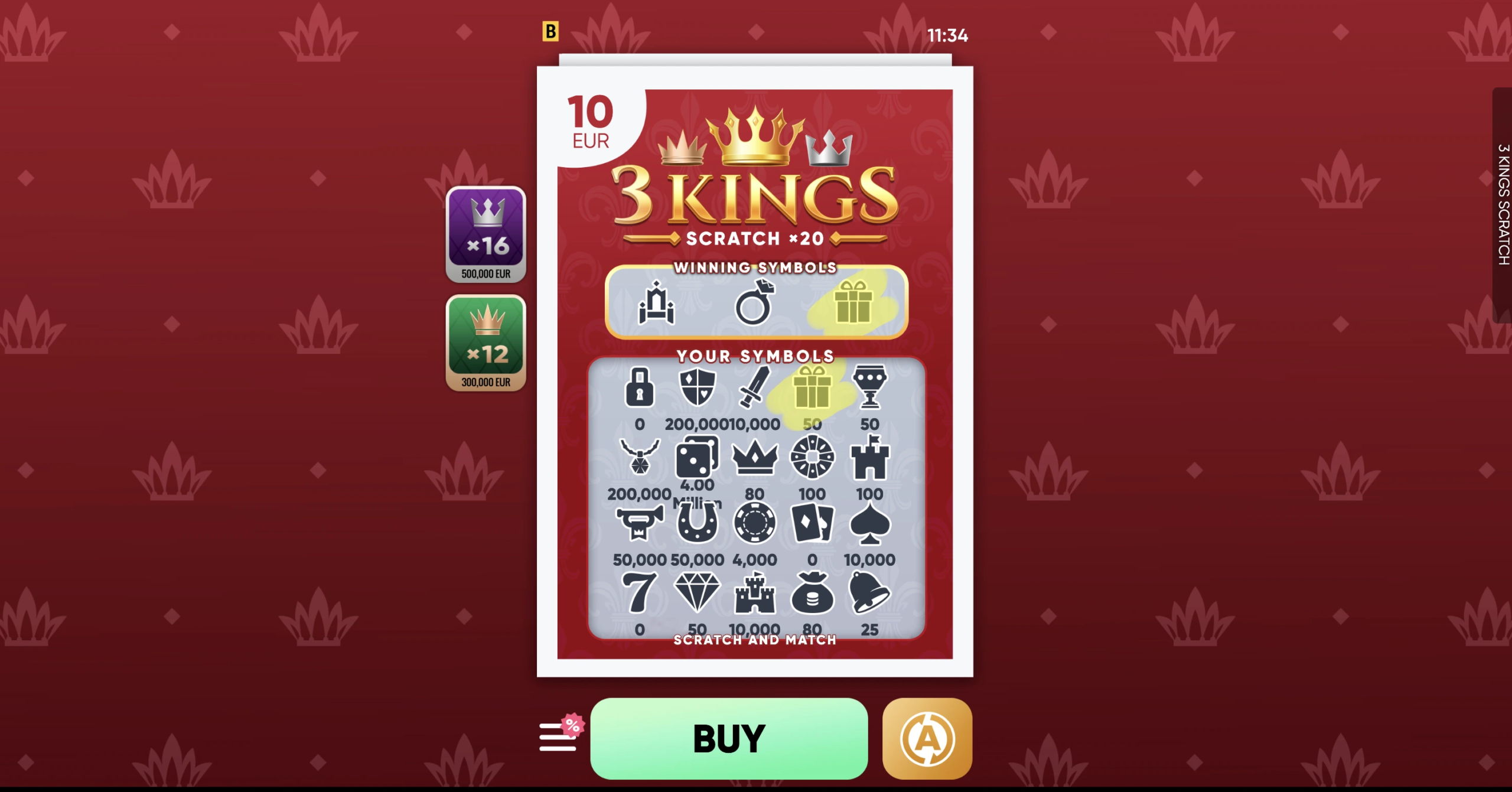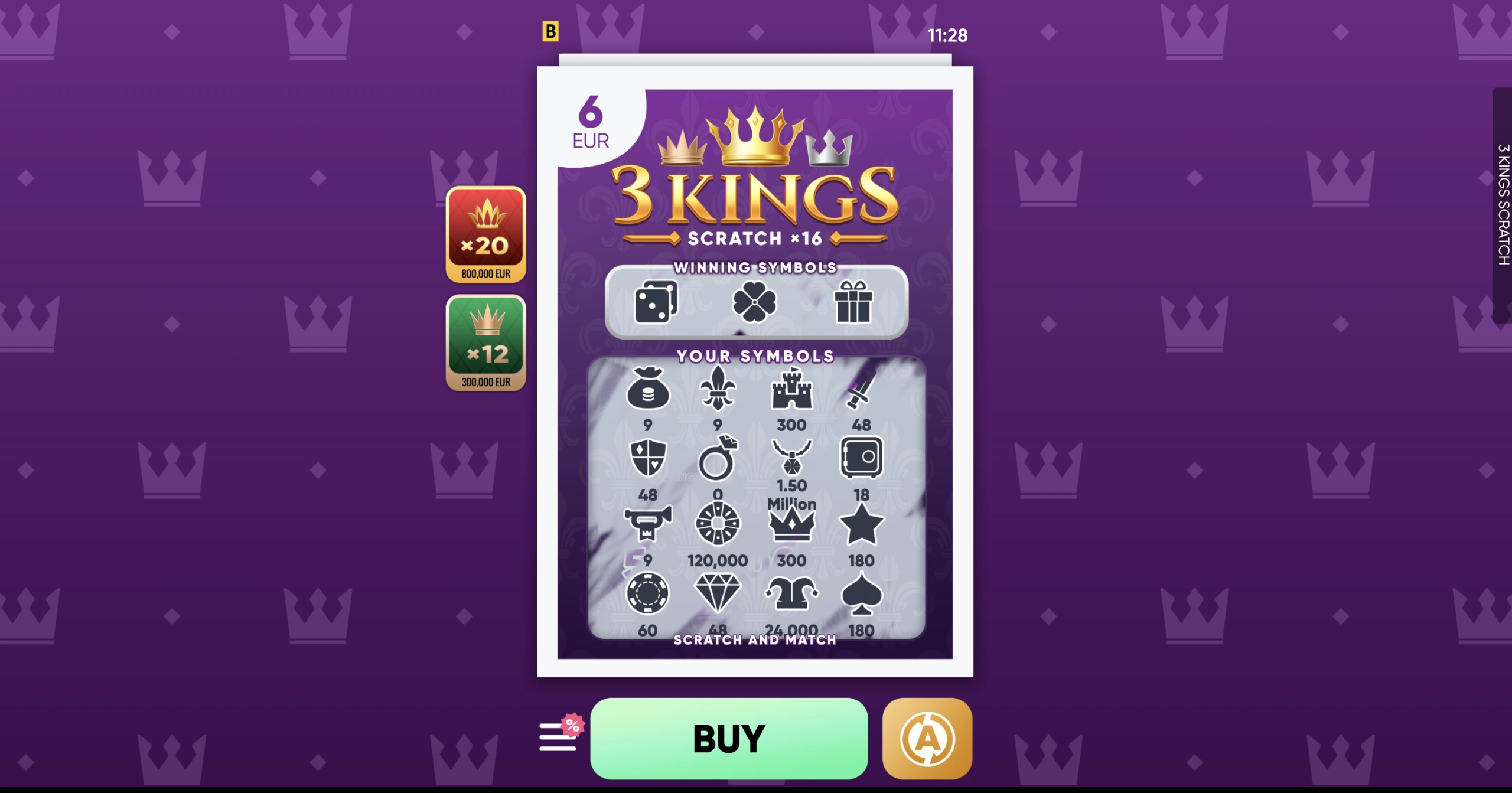 3 Kings Scratch consists of Green, Purple, and Red games, each with different bet values and playing layouts that players can switch in-game. At the start, one identical field for all titles gives players three random symbols for the round. A win occurs if one of these symbols appears in the second, larger playing field, with payout values beneath the symbols.