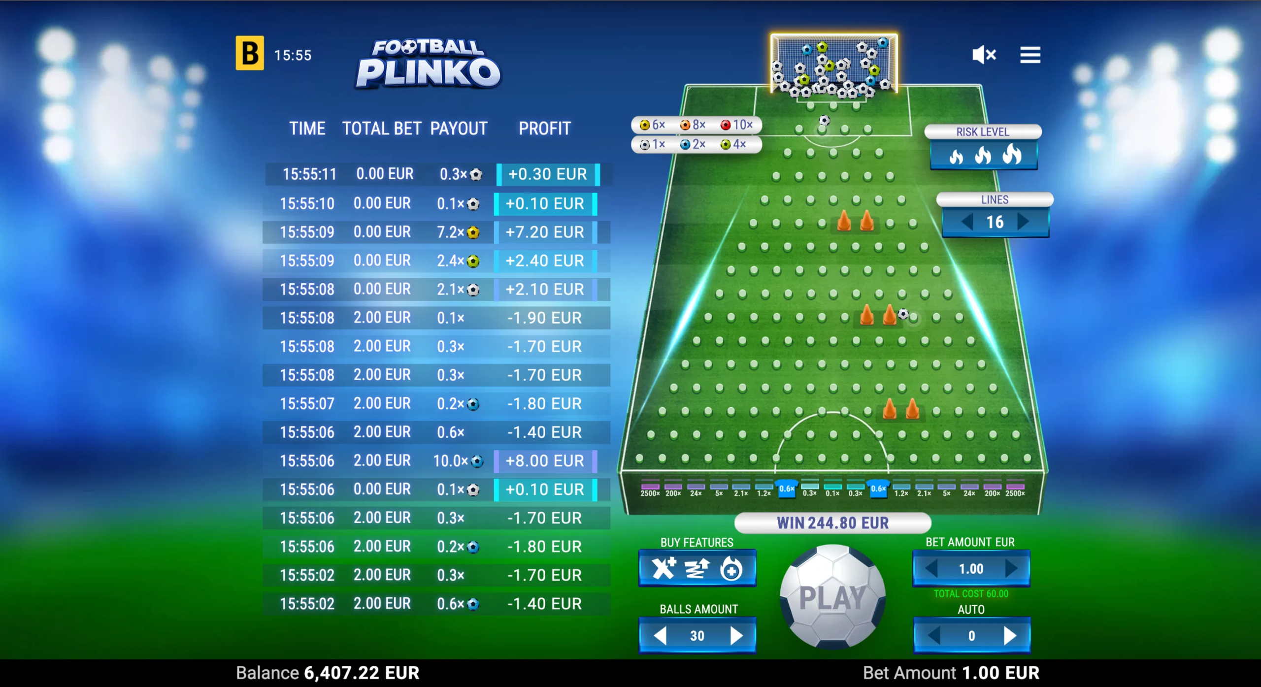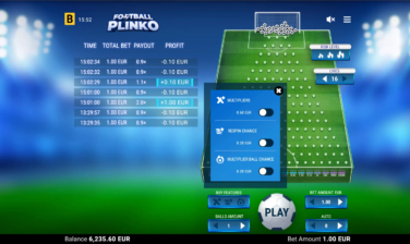 The maximum win in BGaming’s Football Plinko can reach up to x10,000 of the player’s bet. By strategically combining various features, players have the potential to unlock big wins and significantly boost their earnings.