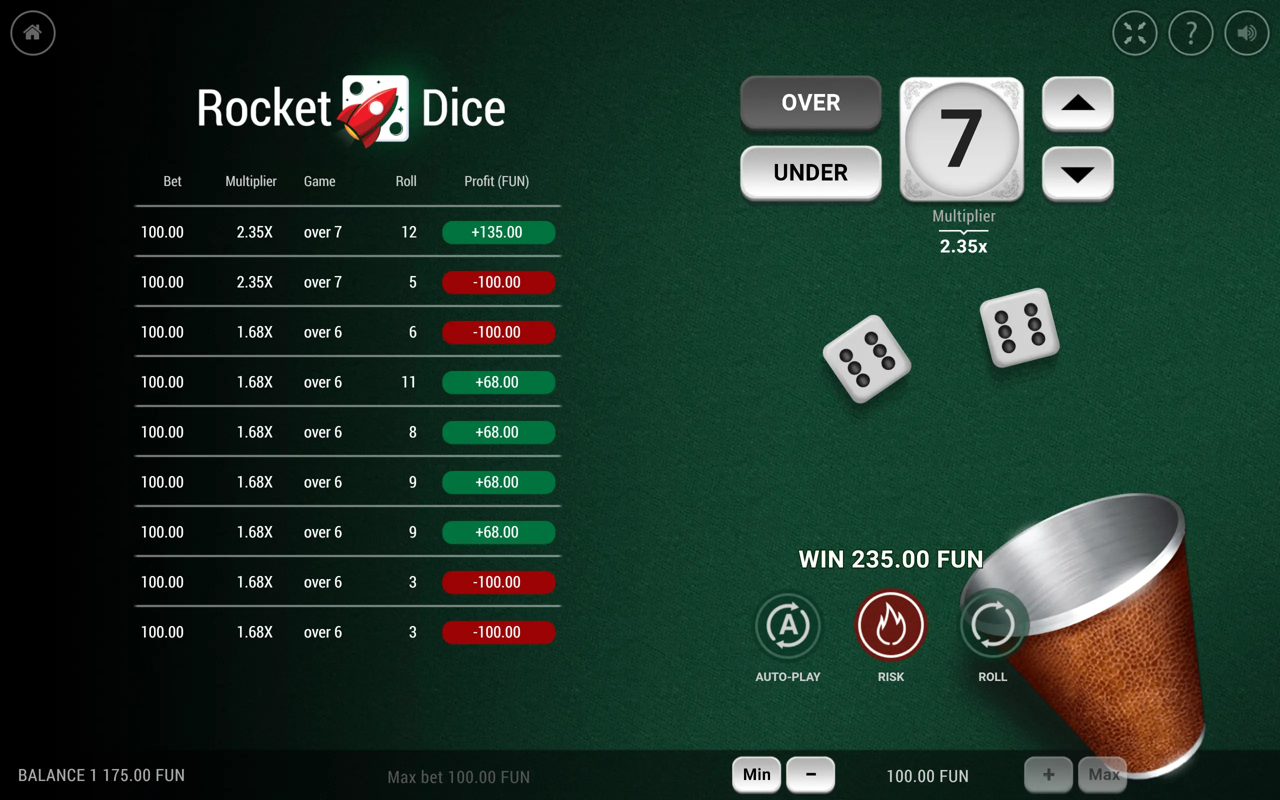 Rocket Dice oferece aos jogadores a oportunidade de ganhar muito com sua mecânica de jogo única. O pagamento pode multiplicar significativamente sua aposta em até x35,30, apresentando baixa volatilidade e empolgantes potenciais de ganho com base no nível de risco escolhido.